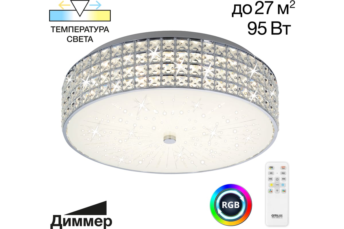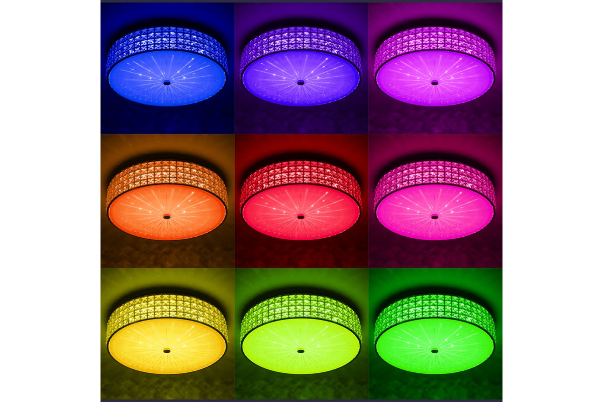В изделии установлены яркие светодиоды основного света и цветной RGB подсветки. С помощью пульта доступно: плавная регулировка яркости от 10 до 100%, управление цветовой температурой от 3000К до 5500К позволяет настроить любые оттенки теплого, нейтрального или холодного света. Цветная RGB подсветка имеет различные режимы работы. Есть функция отсроченного выключения, 4 настраиваемых режима памяти, которыми также можно управлять настенным выключателем. Пульт ДУ в комплекте, тип батареек ААА (батарейки в комплект не входят, приобретаются отдельно). Подходит для всех типов потолков, в том числе натяжных. Тип крепления – планка. Мощность изделия 68Вт, световой поток 5800Лм. Свет безопасный для глаз, без мерцания и пульсаций.