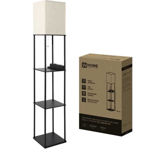 Светильник напольный этажерка IN HOME ТНО 10USB-Е27-NB USB-C розетка, бежевый абажур, черный корпус 4690612064482