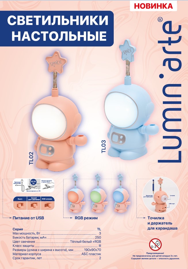 Светильник настольный, ночник Lumin'arte теплый белый свет +RGB (разноцветный) космонавт розовый TL02