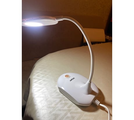 Выключатель расположен на корпусе светодиодного настольного светильника, что удобно в использовании. Гибкая регулируемая ножка позволяет настроить направление света так, чтобы он падал на нужное место. Длина провода составляет 1,2 м.