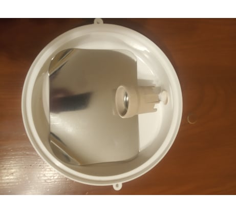 Светильник полностью соответствует описанию.Крепление на стену через три отверстия в корпусе.Внутри корпуса съемный жестяной отражатель.Керамический патрон Е27 крепится внутри светильника саморезом. Уплотнительное кольцо светофильтра и заглушка отверстия под провод жестковаты. Сам светильник упакован в пленку.Использую с светодиодными лампами,энергосберегающие и лампы накаливания не устанавливал.