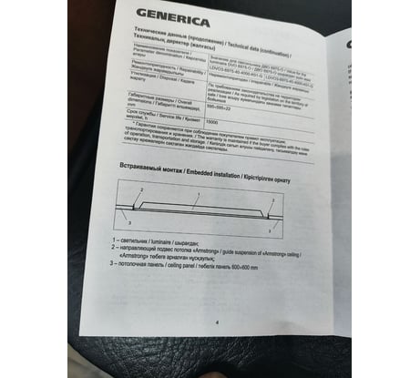 Отличный светодиодный светильник для офиса. Покупаем не первый раз под замену аналогичных люминесцентных светильников в потолках типа Армстронг, чтобы не мучиться со сдачей старых неисправных ламп. Корпус у светильника металлический, рассеиватель пластиковый (матовый опал). Собран светильник отлично, ни одного раза брака не попалось. Внутри стоят светодиоды общей мощностью 40 Ватт и температурой 6500К ( холодный белый цвет). Для удобства подключения у светильника от драйвера наружу выведен провод для подключения, который уже зачищен на концах. Светит светильник ровно, не мерцает. Светильник продается в пленке, инструкция прилагается. В целом, светильником довольны - устраивает и качество, и цена.