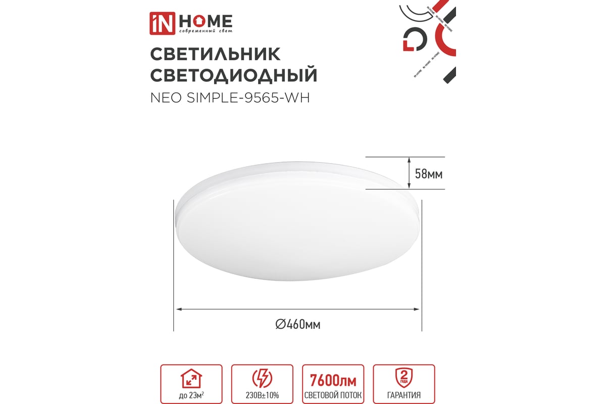 Светильник светодиодный IN HOME NEO SIMPLE-9565-WH 95Вт 230В 6500K 7600Лм 460x67мм белый 4690612060866