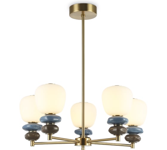 Светильник выполнен из металлического каркаса бронзового цвета, плафонов белого матового стекла и декорирован элементами из фарфора.