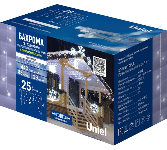Качественная гирлянда электрическая торговой марки Uniel применяется для создания интересной световой иллюминации в жилых домах, в офисах и административных зданиях, в школах и детских садах, светового оформления витрин, балконов, оконных проемов, гаражей, помещений под навесом, добавляет уюта и гармонии в любое пространство. Подходит для различных тематических мероприятий или повседневного оформления помещения.