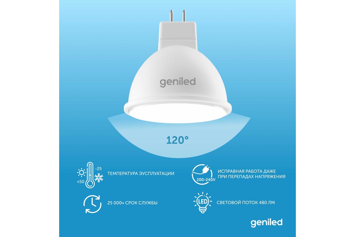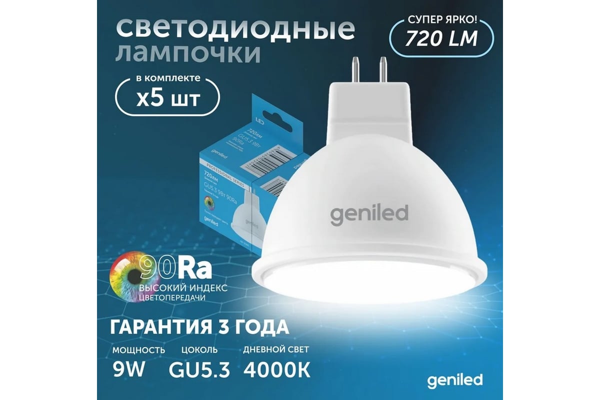 Светодиодная энергосберегающая лампа geniled GU5.3 MR16 9Вт 4000K 90Ra Софит 5 шт 01385_4000_5