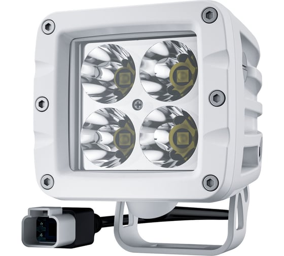 AURORA ALO-M-2-P4T — компактная квадратная светодиодная фара дополнительного света из морской серии с белым корпусом. Оптика настроена на дальний белый свет с узким углом 10° и дальностью луча до 250 м, что обеспечивает уверенную видимость на высоких скоростях, навигацию в тёмное время и точечную подсветку объектов.