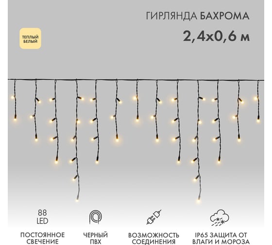 Вопросы и ответы о гирлянде Neon-Night Бахрома постоянное свечение 2,4х0,6м 88 LED белый 255-046