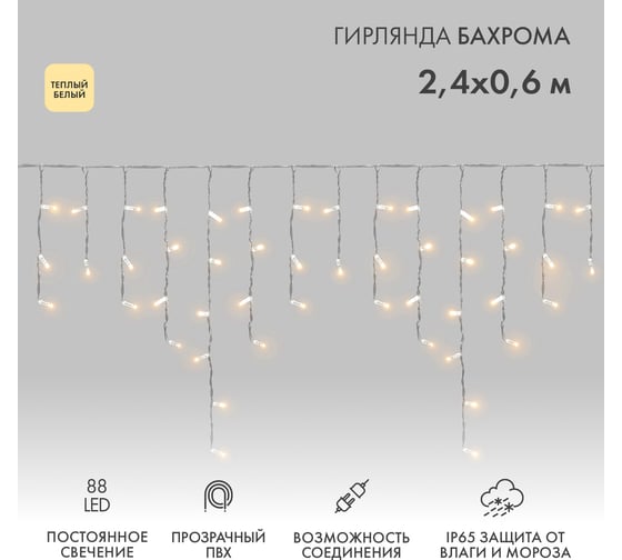 Вопросы и ответы о гирлянде Neon-Night Бахрома постоянное свечение 2,4х0,6м 88 LEDтёплый-белый 255-056