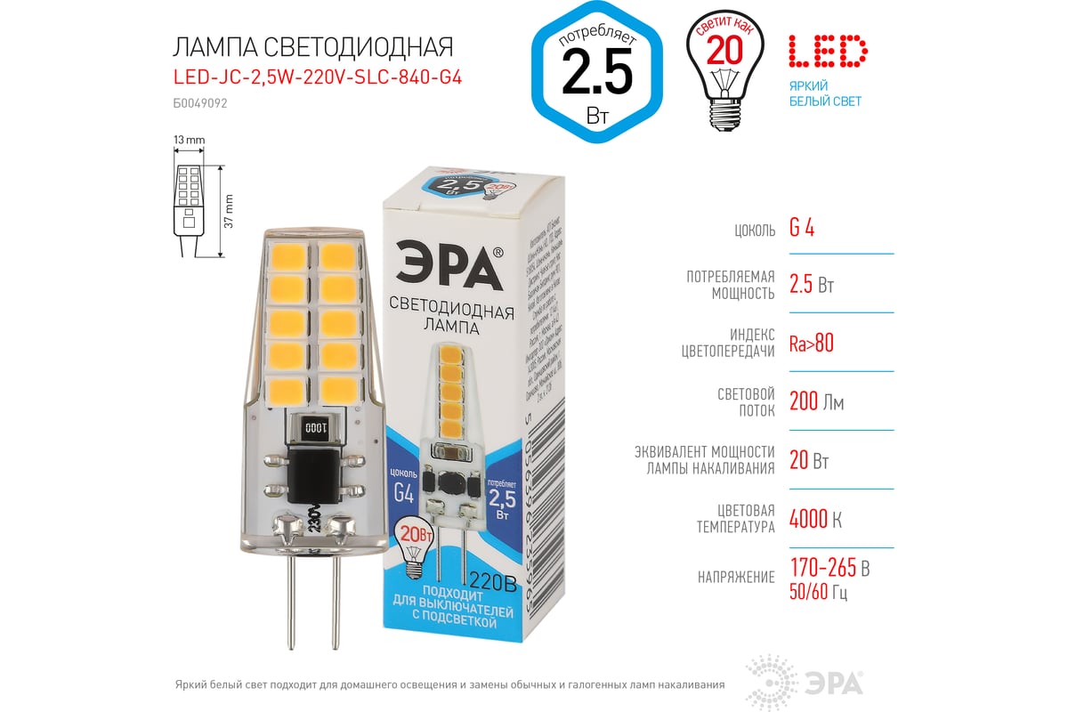 Вопросы и ответы о светодиодной лампе ЭРА LED-JC-2,5W-220V-SLC-840-G4 диод, капсула, 2,5Вт, нейтральный свет, G4 Б0049092