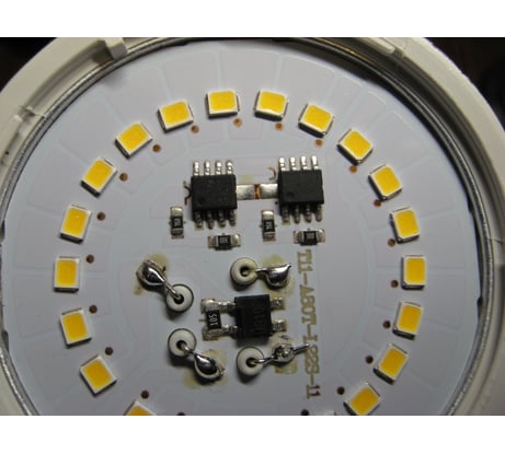 Лампа проработала 3 года, после чего стала мигать, а после и совсем погибла. Реальная мощность около 17 Вт. Драйвер на одной подложке со светодиодами, что плохо.