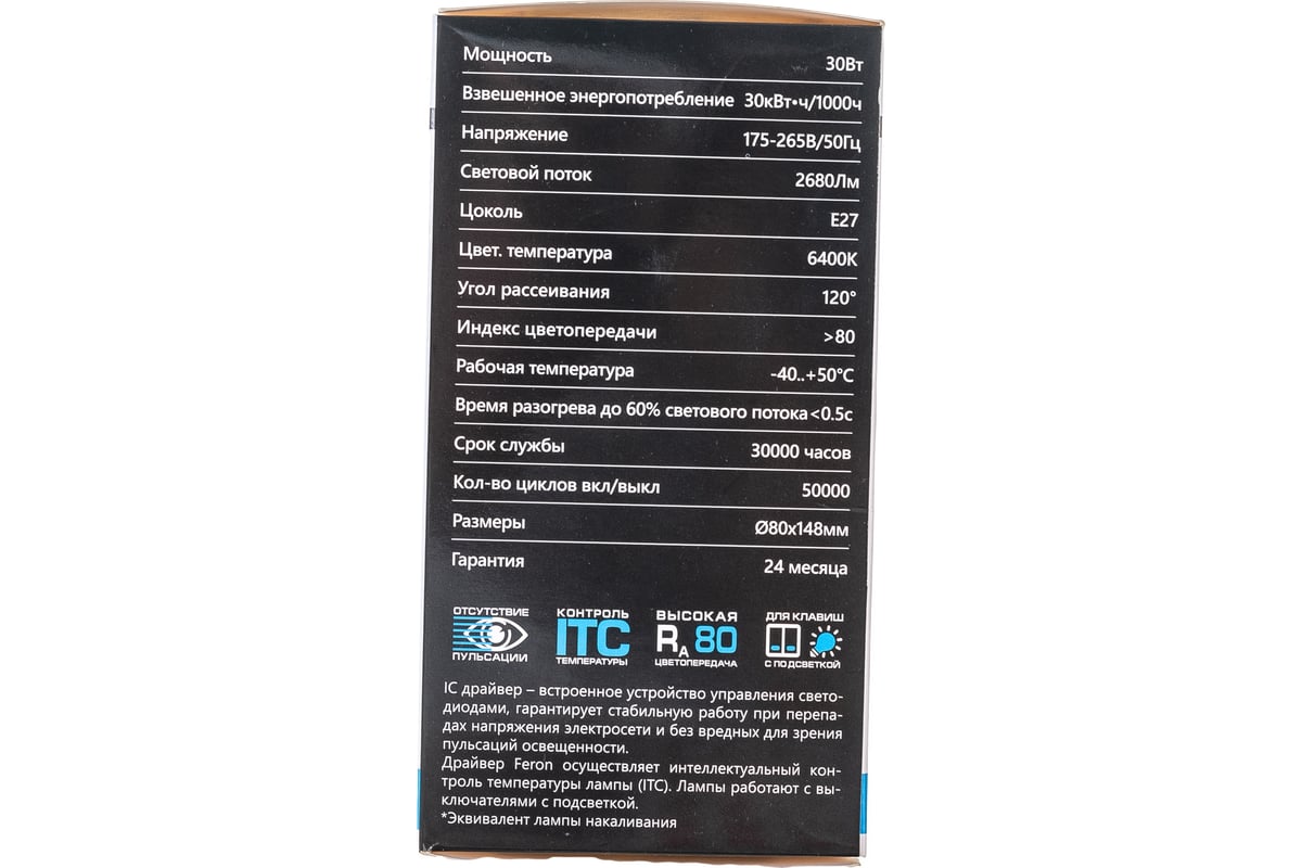 Технические характеристики FERON LB-130 Шар E27 30W 6400K 38196