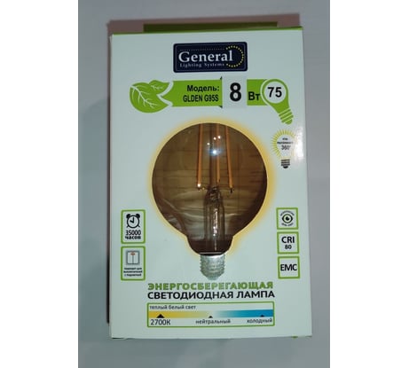 Отзывы о светодиодной лампе General Lighting Systems Филамент прозрачный золотой E27 8Вт 810Лм 2700К Теплый белый свет Шар GLDEN-G95S-8-230-E27-2700 655307