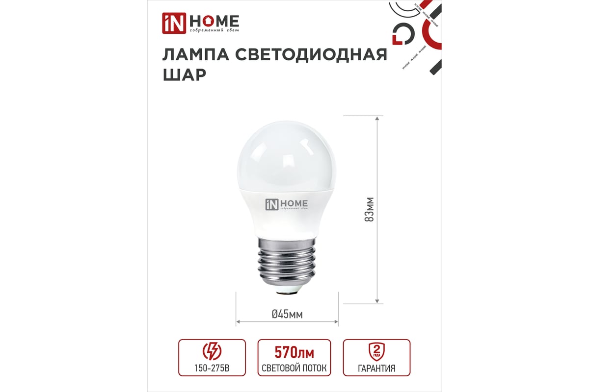 Вопросы и ответы о светодиодной лампе IN HOME LED-ШАР-VC 6Вт 230В Е27 4000К 570Лм 4690612020532