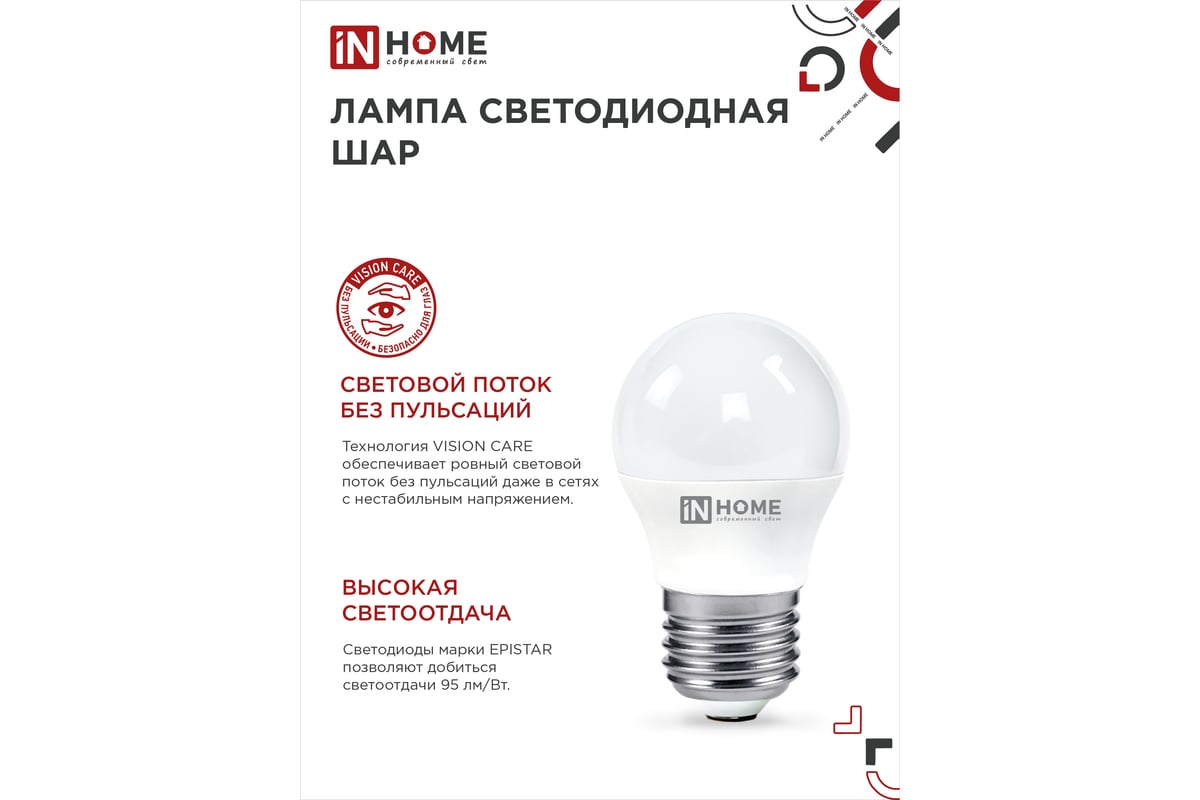 Светодиодная лампа IN HOME LED-ШАР-VC 6Вт 230В Е27 4000К 570Лм 4690612020532 относится к серии «Vision Care», которая характеризуется равномерным световым потоком без пульсаций.