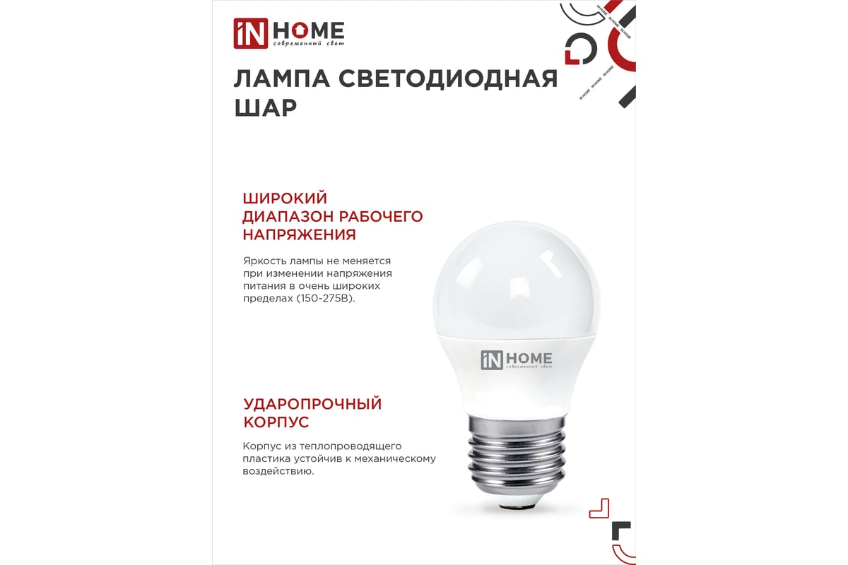 Преимущества IN HOME LED-ШАР-VC 6Вт 230В Е27 4000К 570Лм 4690612020532