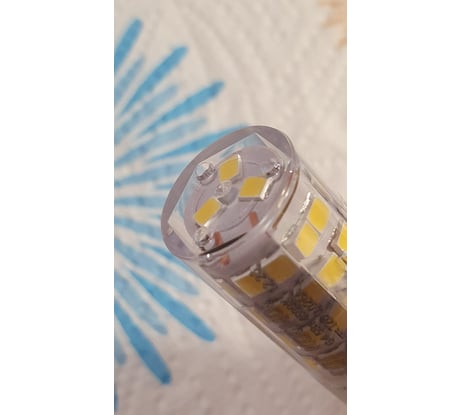 Диаметр 16мм, высота без учета контактов 34мм, вес по факту 9.00гр. Конструктивно шесть вертикалей по пять диодиков и еще три диодика сверху (всего 33). Яркость ниже ожидаемого от пяти ватт. По температуре свечения визуально порядка 3800K и это мне нравится, однако это условно, т.к. такие диодики, если производитель намеренно с этим эффектом не борется, конструктивно дают по краям фиолетовые полоски и через прозрачный плафон это видно в виде орнамента на потолке при включении одной лампы (это не хорошо и не плохо - как есть). Греется прилично, пульсация (мерцание) неприличная (порядка 50ГЦ), так быть не должно, за что и ставлю соответствующую оценку данному экземпляру.