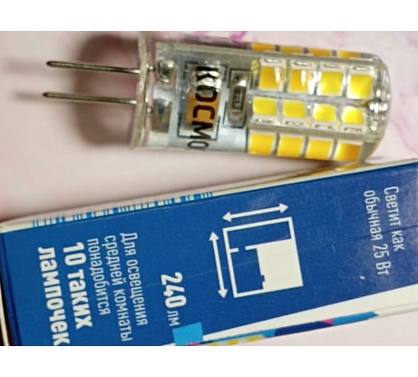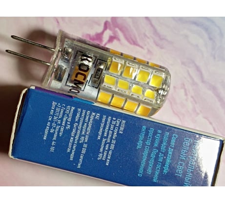 Тут вот какая история… В моей гостиной люстра с пятью абажурами с резьбовыми цоколями и одним абажуром со штырьковым цоколем, предназначенным для вечерней подсветки. С обычными лампами проблем с заменой не возникает, но вот впервые миниатюрная лампа перегорела, и с подбором возникли трудности. На помощь пришли специалисты ВИ, разъяснив как правильно подобрать, а также в разделе вопросов откликнулся пользователь сайта, за что всем выражаю признательность. Искала лампу с цоколем G4 на сайте ВИ, сразу выбрала производителя «КОСМОС», поскольку знакома с товарами бренда и нравится качество продукции. Заказала, лампа приехала в нарядной упаковке с описанием товара, а еще подробнее в инструкции. Важной частью лампы является цоколь, чтобы подобрать необходимую модель, надо разобраться во всех тонкостях. Маркировка G4 означает, что цоколь выполнен в виде металлических штырьков, и расстояние между ними 4 мм. Форма лампы в виде колбы или космической ракеты. Штырьки предназначены для фиксации лампы и питания ее напряжением. Демонтировала старую лампу, потянув её при выключенном электропитании. В соответствии с правилами установки проверила совпадение контактов и пазов в патроне, вставила новую лампу, убедилась в надежной фиксации, надела абажур. Готово! Лампа обеспечивает ровный свет, который создает комфортную атмосферу в помещении, эквивалент лампы накаливания 25 Вт, цветовая температура 4500К, это нейтральный белый свет. Лампа почти не нагревается, даже в закрытом декоративном плафоне. При загрязнении лампу протираю сухой мягкой тканью. Покупала для создания комфортной подсветки в вечернее время. К покупке точно рекомендую, товар качественный от известного бренда.