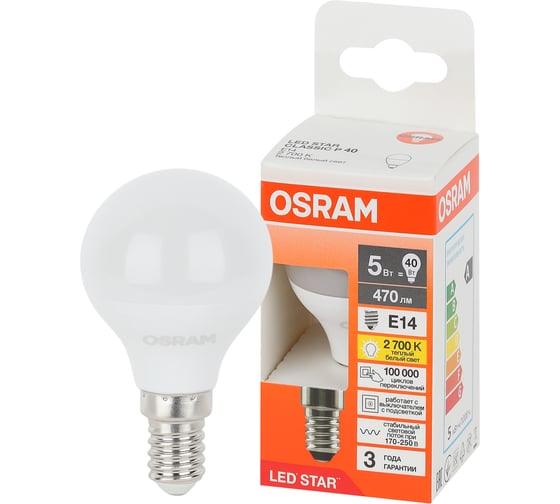Лампа светодиодная OSRAM LED Star 5,7 Вт, 470лм (замена 40Вт), 2700К (Теплый белый свет). Цоколь E14, колба P. Исполнение колбы матовое, пластик. Напряжение питания 220-240В. Товар сертифицирован