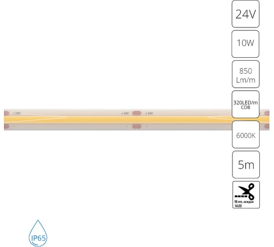 Светодиодная лента ARTE LAMP 24В 10Вт/м 850Лм/м 6000К 90 8мм COB 320ш A2432008-06-6K