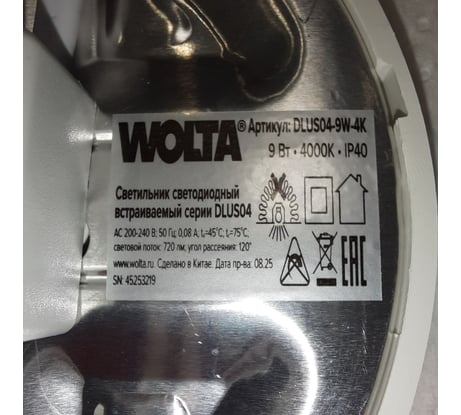 Светодиодная встраиваемая круглая панель Wolta 9Вт, 4000К Дневной белый свет, IP40, 720лм, с регулировкой под отверстие от 50 до 100 мм DLUS04-9W-4K