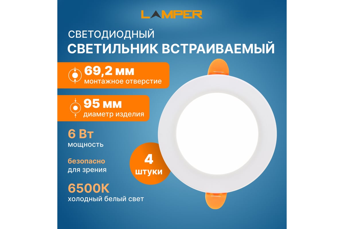 Светодиодная встраиваемая панель Lamper 6Вт, 230В, 6500К, 420Лм, 95мм, белая, IP20 606-1005