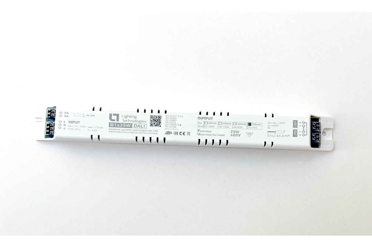 Номинальная мощность 25 Вт, фиксированный выходной ток 300 мА, в пластиковом корпусе, степень защиты IP20, без гальванической изоляции, диапазон входного напряжения 176–264 В, диапазон выходного напряжения 40–83 В постоянного тока. КПД до 92% при максимальной нагрузке, пульсация светового потока менее 5% (в диапазоне до 300 Гц), активный корректор коэффициента мощности. Диапазоны диммирования по протоколу DALI: 1–100%. При работе в системе DALI требуется внешний источник питания шины, полярность подключения не важна.