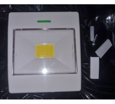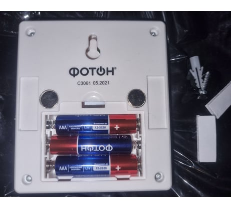 В комплекте 3 щелочных батарейки ААА, саморез, две клейкие двусторонние липучки (слабенькие, одноразовые). Можно проверить работоспособность через упаковку. Достаточной яркости свет.