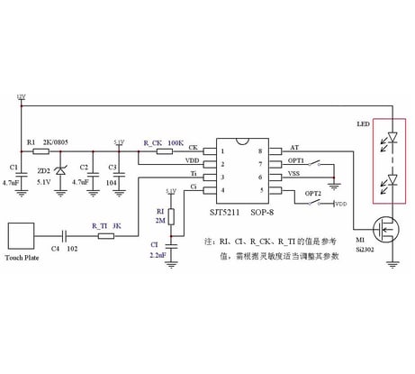 Кому нужна ответная часть, разъём называется 3.5*1.3 мм (по крайней мере подобрал в радиомаркете такой тип). На полной яркости при 12 вольтах потребляет 230 ма. При 13.5 вольт потребляет 350 ма (автомобильная сеть) и соответственно ярче светится. Не могу пока предположить, сколько при таком токе проживут светодиоды, но само собой более меньший срок эксплуатации будет. Теперь по делу. Используется микросхема sjt5211c. На фото типовая схема подключения (выписка с документации) и результаты моих экспериментов. Изначально в этом модуле идёт запаянная 5-я ножка микросхемы с плюсом питания (U1 - стабилизатор питания микросхемы 5 вольт в данном модуле подсветки) жирной каплей припоя. На фото микросхема уже с снятой перемычкой припоя. Режимы: Режим из-коробки, который предоставляет всеинструмены - 1+2 замкнут, 3+4 разомкнут, при подаче напряжения выключен, касание к сенсору - максимальная яркость. 1+2 разомкнут, 3+4 разомкнут, при подаче напряжения выключен. Четыре режима - выключено, минимальная-средняя-максимальная яркость. 1+2 разомкнут, 3+4 замкнут, при подаче напряжения минимальная яркость. Пять режимов, минимальная - средняя - больше средней - максимальная яркость, выключено. 1+2 замкнут, 3+4 замкнут, при подаче напряжения выключен. пять режимов, выключено - минимальная - средняя - больше средней - максимальная яркость.