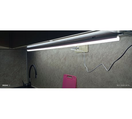 Матовый рассеиватель, отдельных светодиодов не видно. В комплекте два крепления (скобки, саморезы, дюбели), провод с вилкой для подключения, провод с разъёмами для каскадирования светильников, заглушка на неиспользуемый разъём.