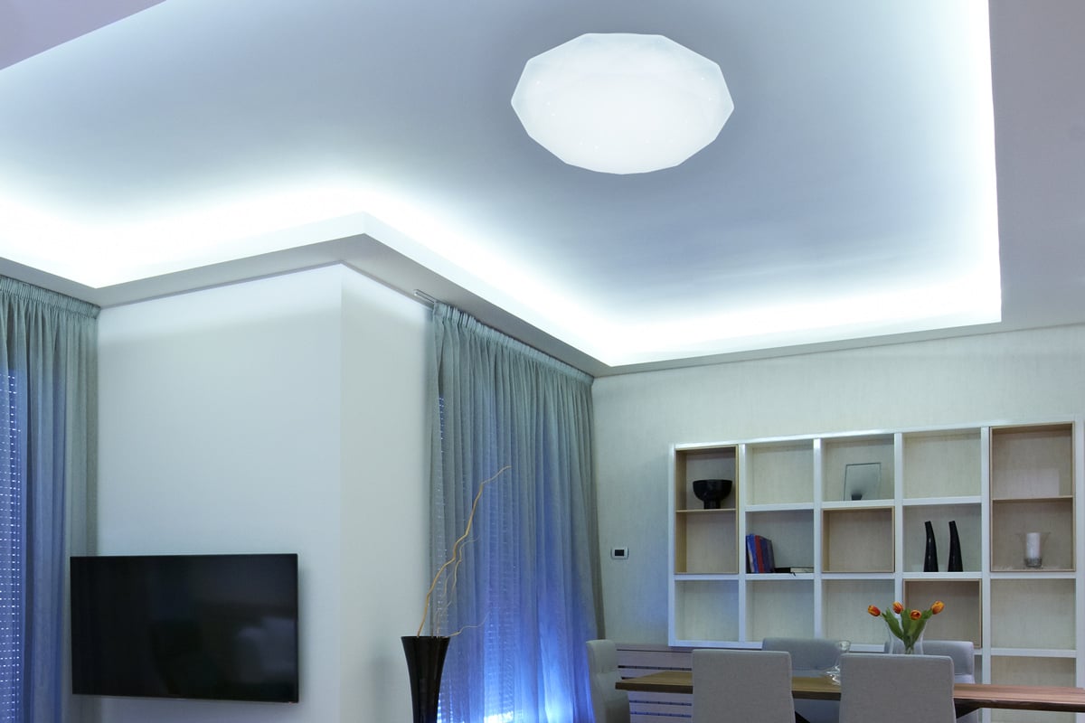 яркий свет, много режимов, пульт управления, стильный дизайн, совместимость с натяжным потолком, доступная цена