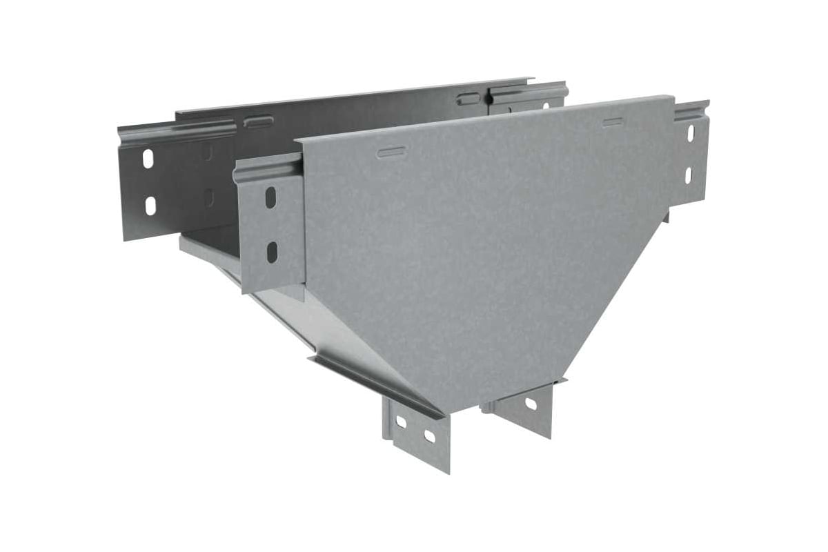 Для отвода трассы вниз используется Т-ответвитель переходник вертикальный c разворотом трассы на 90 градусов "PLUS", при этом разворачивая открытую часть лотка вокруг своей оси под прямым углом.