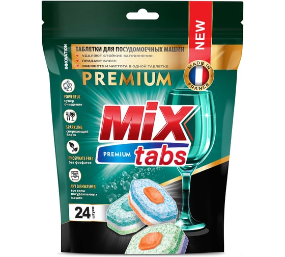 MIX TABS — это современные таблетки для посудомоечных машин, созданные на основе безфосфатной формулы и произведённые во Франции. Они отличаются мощным очищающим действием, инновационной рецептурой и универсальностью: таблетки подходят для всех типов посудомоечных машин и не оставляют разводов на посуде.