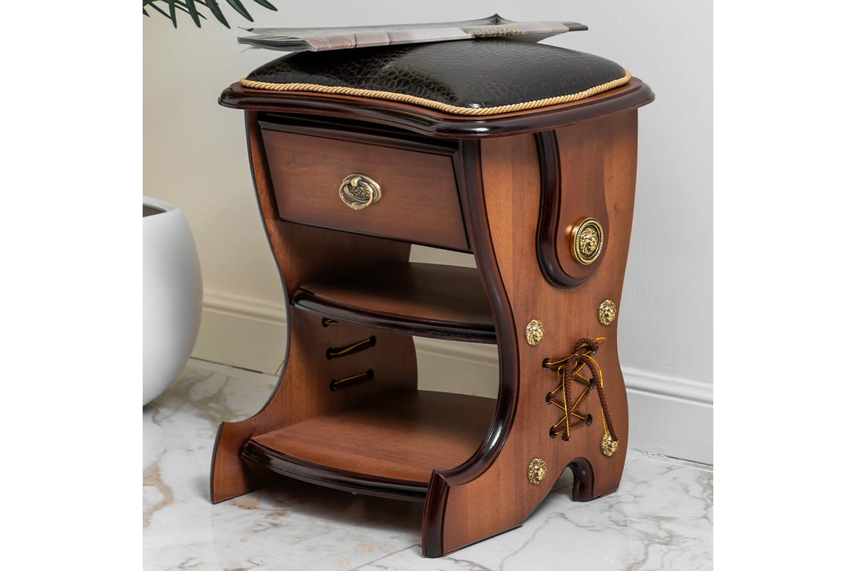 Табурет BOGACHO Сапог с ящиком 11136/шоколадный оснащен верхним выдвижным ящиком и двумя полочками. Выполнен в виде сапога. Торцевые стороны табуретки декорированы шнуром. Изделие отличается прочной устойчивой конструкцией и прослужит не один год. Пуфы облагораживают интерьер, вносят в него нотки разнообразия, индивидуальности, кроме того, они весьма комфортны и универсальны. Каркас табуретки и фасады выполнены из качественного МДФ, облицованного ламинированной пленкой. В качестве наполнителя посадочного места используется пенополиуретан, отделка выполнена из высококачественной кожи с обрамлением декоративным кантом. Фасады декорированы позолоченными мраморными медальонами с изображением львов. Фурнитура выполнена из латуни испанского производства.