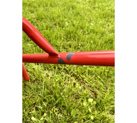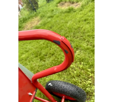 Заказывал четыре раза, приходили четыре тачки и все четыре в отвратительном состоянии. На фото серым цветом видно закрашенные мной места, где содрана краска. Это лучший вариант из четырёх. На последнем фото другая тачка, которую вернул. Это место было стрейчплёнкой замотано, как специально. Остальные три все ободранные, гнутые рамы, как они это везут я не понимаю, захочешь не сможешь так тачку испортить.