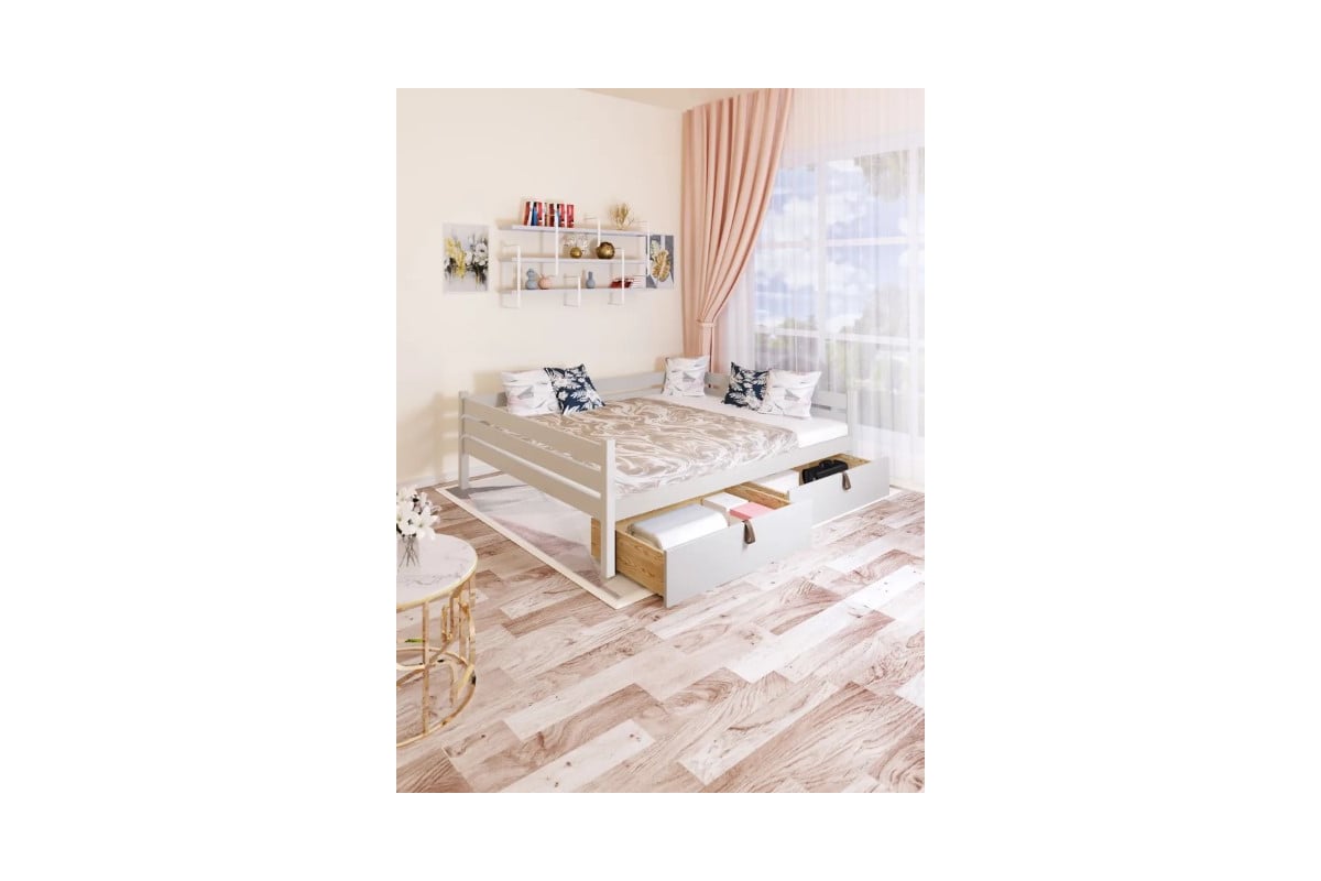 Тахта двуспальная Solarius из массива сосны со сплошным основанием, 180x180 см, габариты 190x190 см, с двумя выкатными ящиками, цвет платины tahta180-180plat-full-2yash