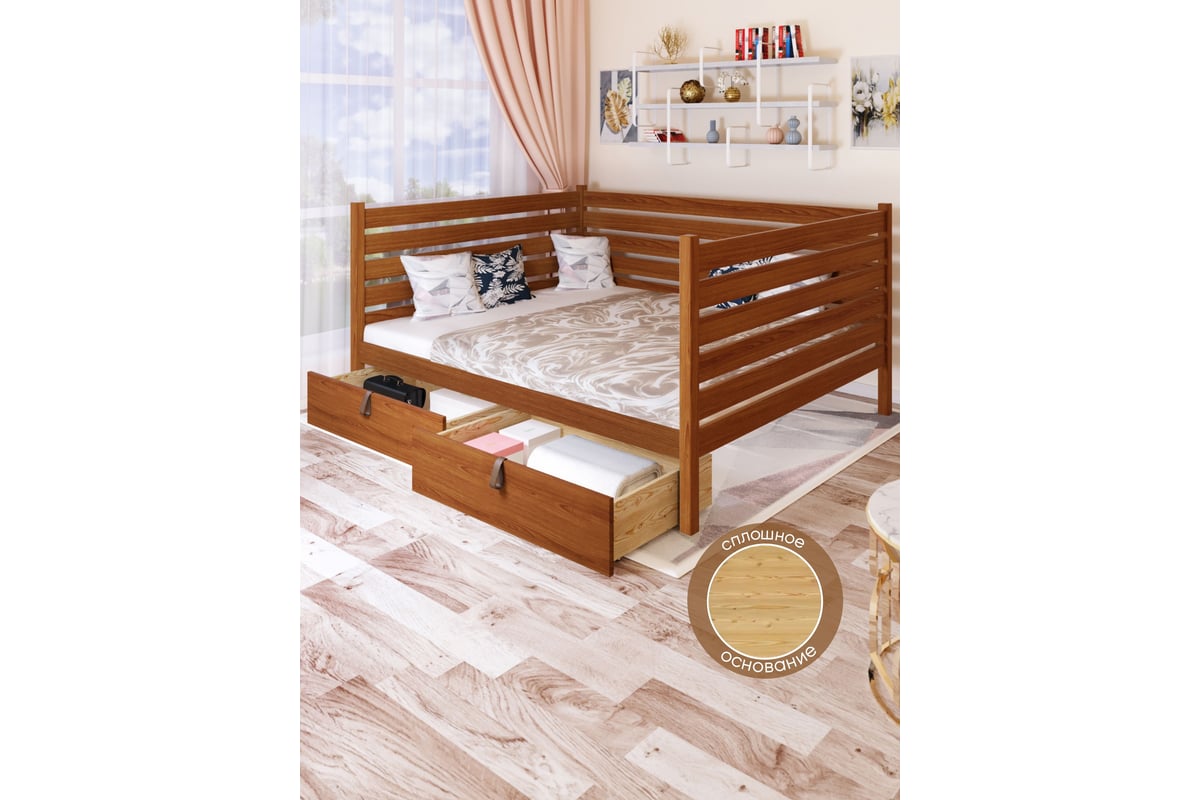 Тахта двуспальная Solarius из массива сосны со сплошным основанием и высокими бортиками, 120x180 см (габариты 130x190), с двумя выкатными ящиками, цвет ольхи tahta-spin120-180olha-full-2yash