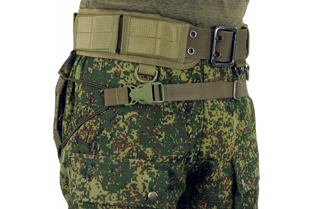 - Фиксация на пояс человека при помощи регулируемой стропы с фастексом, а также резинок
