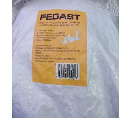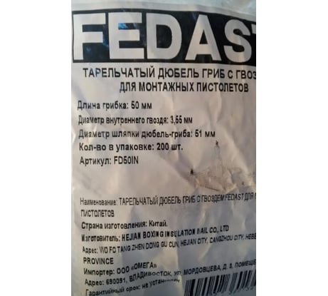 Тарельчатый дюбель гриб с кованым гвоздем для монтажных пистолетов FEDAST IN50-BP (200 шт/уп) FD50IN-BP