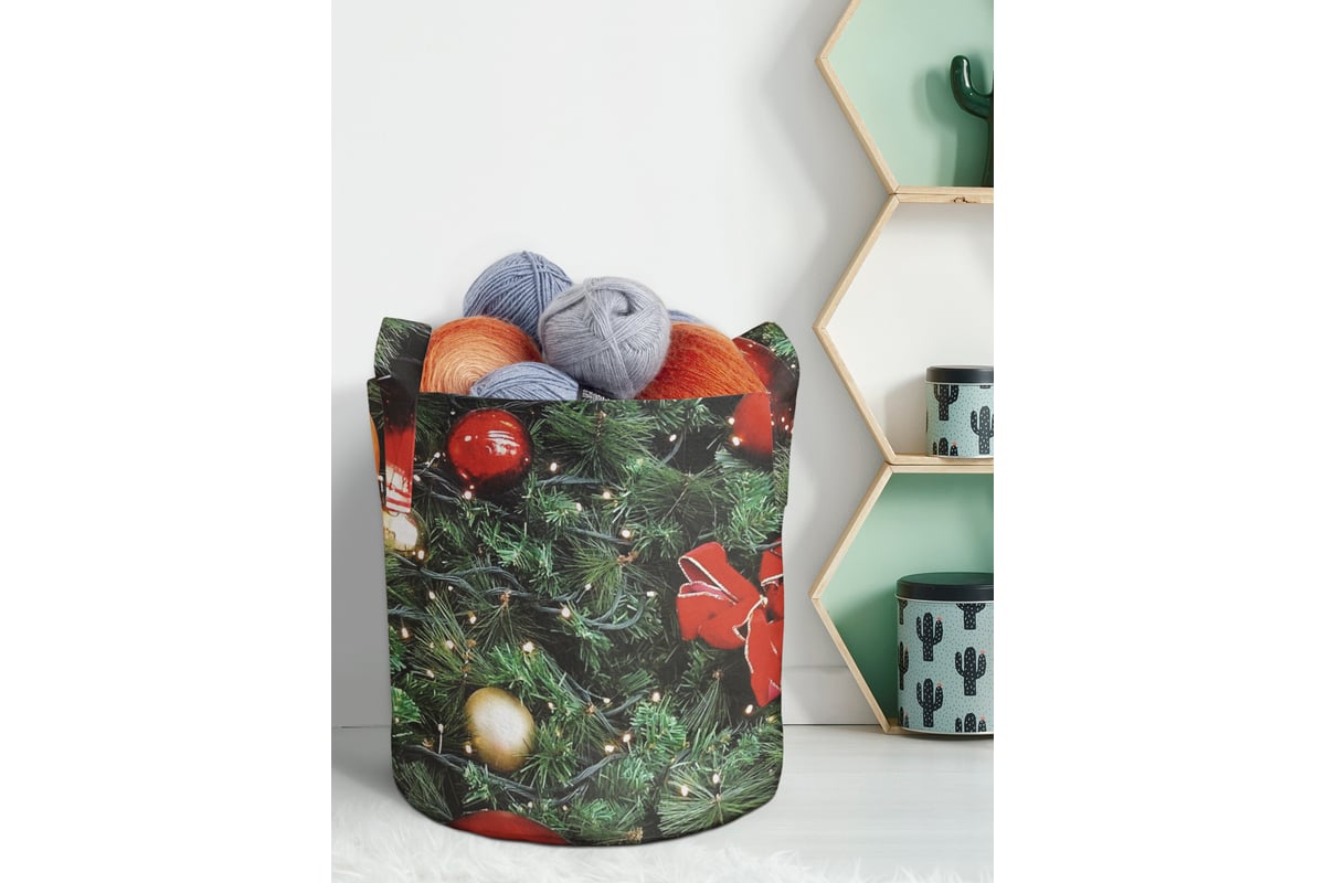 Текстильная корзина для хранения вещей и игрушек JOYARTY Елка в шарах 19 литров planta_380794_5 подойдет для хранения вещей и организации порядка в доме. В нее можно сложить домашний текстиль, белье, одежду, детские игрушки и прочие домашние мелочи. Любители больших домашних растений могут использовать изделие как декоративное кашпо. Корзина сохраняет форму благодаря плотной ткани, а с помощью двух ручек ее можно переносить в любое удобное место. Ручки изделия выдерживают большую нагрузку, даже если сложить в нее овощи и фрукты. В зависимости от цветопередачи экрана монитора яркость рисунка может отличаться от изображения на сайте. Допустимо отклонение в размере в пределах 2-3 см.