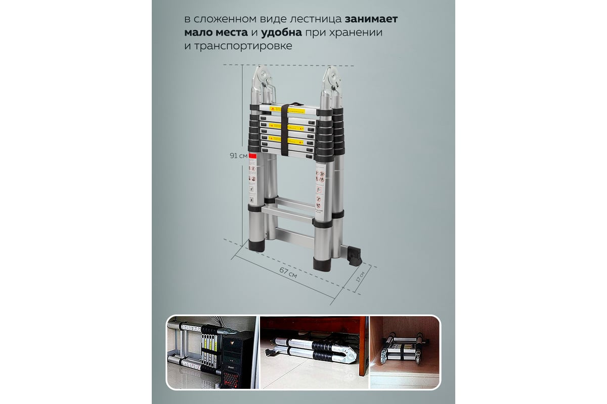 Телескопическая двухсекционная лестница FORSAGE — это идеальное решение для тех, кто ценит надёжность, функциональность и безопасность. Изготовленная из прочного алюминия, она выдерживает нагрузку до 150 кг, обеспечивая уверенность при работе на высоте.