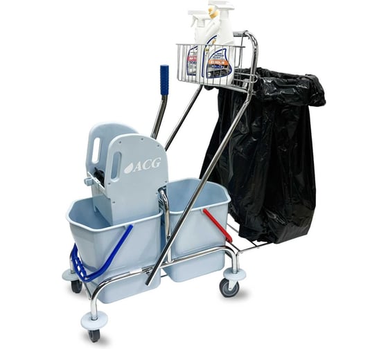 Тележка ACG 2х17л, с держателем мешка, поддоном, ведра серые, с отжимом, корзиной, база хром 1030279