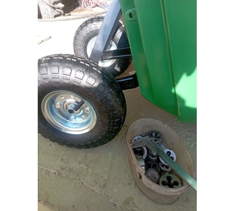 Хорошие пневматические колеса, удобно выгружать листья или снег за счет откидной конструкции. Устойчивая, неплохая проходимость у тележки.