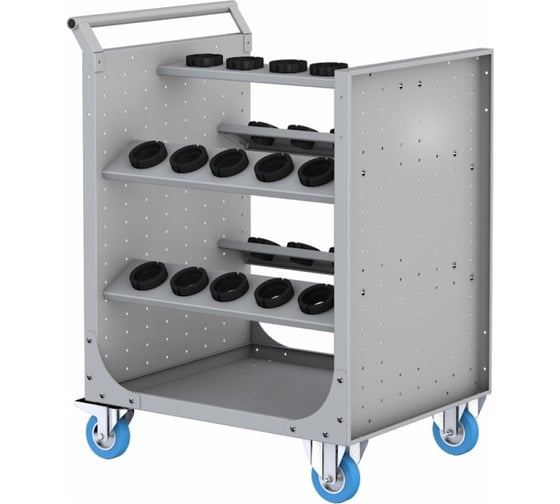 Служит для хранения и перевозки сменного инструмента в оправке HSK63. Сборно-разборный корпус изготовлен из стали толщиной 1,5 мм, полки – 2,0 мм. В полках установлены держатели оснастки из полиамида, устойчивого к ударам и воздействию минеральных масел. Наклонное положение полок облегчает извлечение и установку содержимого полок. Эргономичная ручка из трубы условным диаметром 20 мм расположена на расстоянии 980 мм от пола, что соответствует ГОСТ 13188-67.