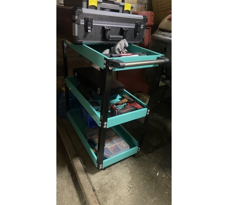 Крепкая тележка, выдерживает тяжелые предметы. Удобно работать, когда долгий ремонт и нужны разные инструменты. Всё под рукой. Рекомендую!