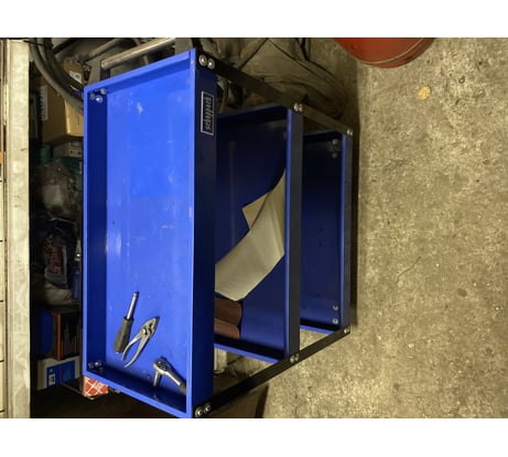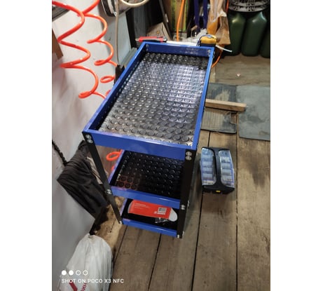 Вполне неплохая тележка для инструмента, металл нормальный. Пришлось подкладывать шайбы под болты при сборке т.к. отверстия овальной формы, при сборке можно немного сыграть по геометрии. В нижнюю полку был уложен лист OSB что придало жесткости. С нижней стороны полок была приклеена виброизоляция что снизило шум и грохот при перемещении.