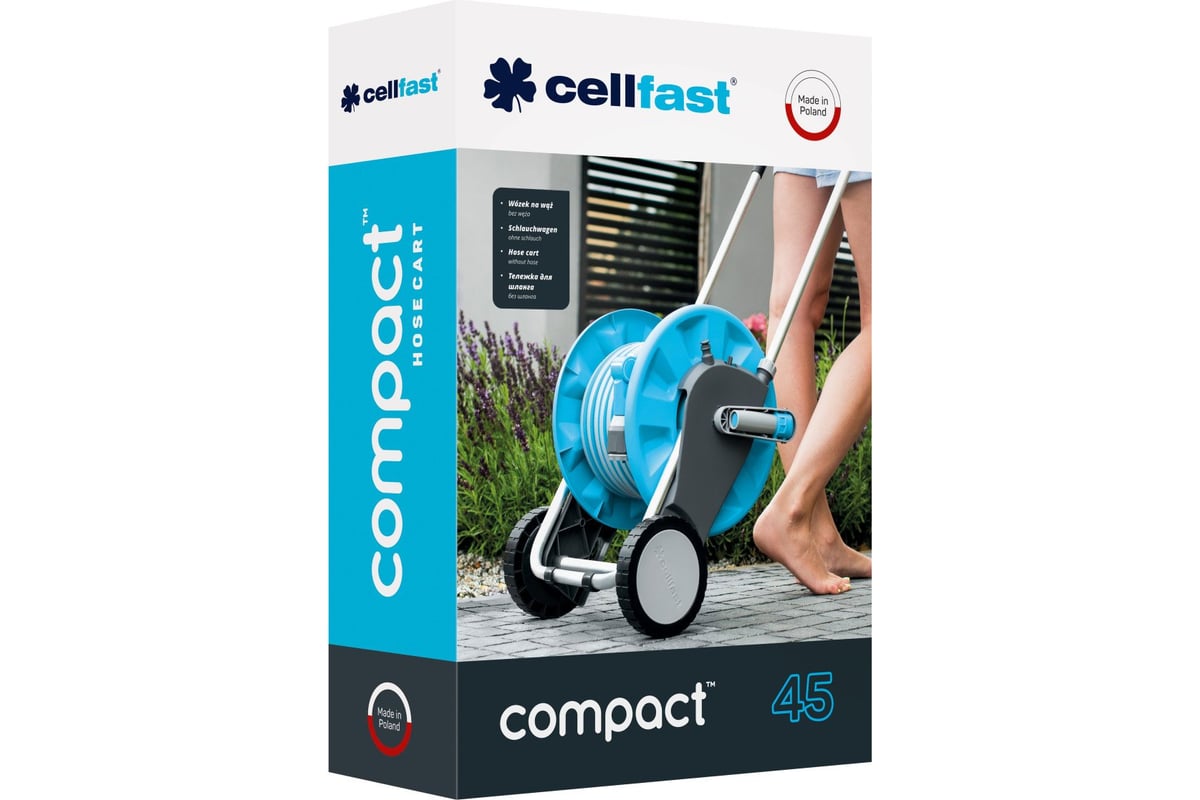 Тележка для шланга Cellfast COMPACT LUZ 55-300 имеет складывающуюся рукоятку и ножку, два колеса для легкости перемещения.