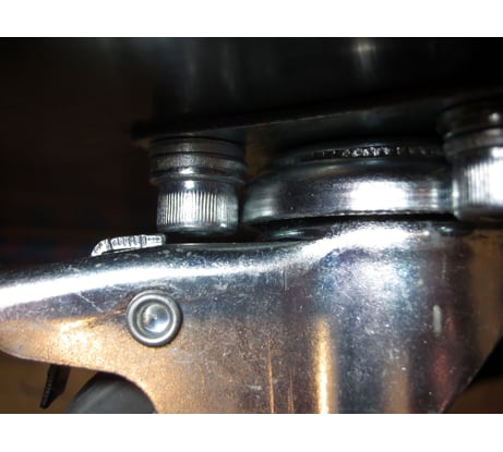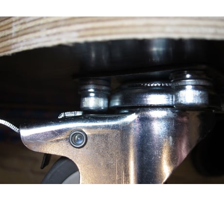 Каждое колесо крепится четырьмя Винтами М6x16, а чтобы торцевая часть винта не торчала с рабочей стороны тележки - перед завинчиванием каждого винта ПРОЛОЖИЛИ ТРИ ШАЙБЫ (см. фото 1)!!! Из-за этой идиотской конструкции за шляпки винтов задевает фиксирующий колесо механизм при вращении колёсной вилки вокруг своей оси (см. фото 2-3)