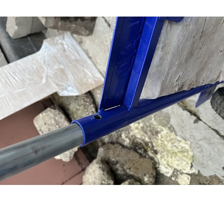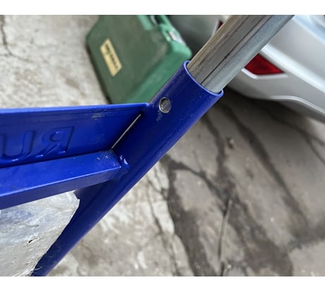 Хорошая телржка. Но я бы попросил производителя добавить сущую мелочь: возможность вставлять ручку обратной стороной. Для этого нужно просверлить одно отверстие в синей трубке сверху? Для себя же я сделал усиленную фиксацию ручки: со второй стороны пальцем-болтом, на фото.
