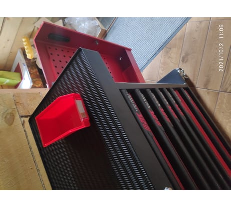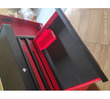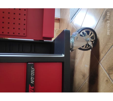 Крепко сделан, качественная фурнитура и материалы. Большие колеса, легко катается. Есть боковые ящики для навесного хранения, в комплекте идут 5 контейнеров для хранения крепежа.